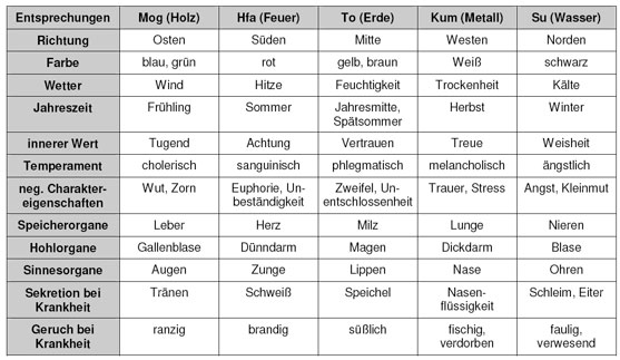 Die fünf Grundkräfte (Oh Haeng), die den Kreislauf der Natur und des Lebens in Funktion und im Gleichgewicht halten, sind: Mog (Holz), Hfa (Feuer), To (Erde), Kum (Metall) und Su (Wasser). Mit Holz, Feuer, Erde, Metall und Wasser sind nicht nur die physischen Elemente gemeint, sondern auch deren Eigenschaften, z. B. das Wachsen und Grünen des Holzes, die Hitze und Helligkeit des Feuers, die Fruchtbarkeit der Erde, die Dichte des Metalls, die Kühle und Dunkelheit des Wassers. Die Eigenschaften der fünf Elemente finden sich nach asiatischer